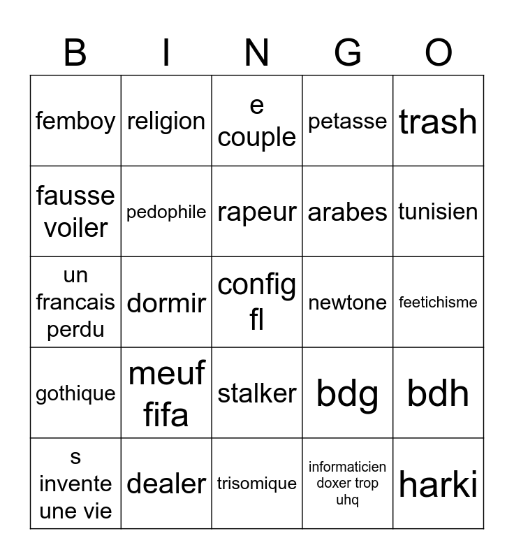 This bingo card has a free space and 24 words: meuf fifa, dealer, rapeur, s invente une vie, trash, femboy, fausse voiler, religion, newtone, stalker, arabes, un francais perdu, bdg, bdh, pedophile, informaticien doxer trop uhq, feetichisme, e couple, tunisien, dormir, harki, gothique, petasse and trisomique.