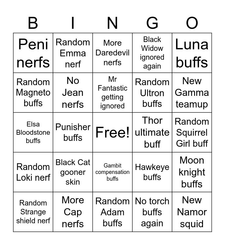 This bingo card has a free space and 24 words: Black Cat gooner skin, More Cap nerfs, Mr Fantastic getting ignored, Random Strange shield nerf, Luna buffs, Peni nerfs, Random Magneto buffs, Random Emma nerf, Thor ultimate buff, Gambit compensation buffs, Random Ultron buffs, Elsa Bloodstone buffs, Hawkeye buffs, Moon knight buffs, No Jean nerfs, No torch buffs again, Random Squirrel Girl buff, More Daredevil nerfs, New Gamma teamup, Punisher buffs, New Namor squid, Random Loki nerf, Black Widow ignored again and Random Adam buffs.