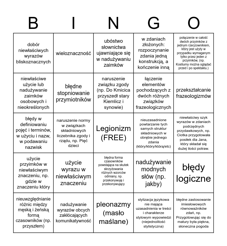 This bingo card has a free space and 39 words: nieodmienianie wyrazów, błędna odmiana wyrazów, nadawanie rzeczownikom niewłaściwego rodzaju (np. ten pomarańcz), błędne stopniowanie przymiotników, nieuwzględnianie różnic między męską i żeńską formą czasowników (np. przyszłem), błędna forma czasowników powstająca na skutek skrzyżowania różnych wzorców odmiany, np. przekonywuję i przekonywujący, naruszenie związku zgody (np. Do Kmicica przyszedł stary Kiemlicz i synowie), naruszenie związku rządu (np. Nie trzeba zwracać uwagę na wszystkie błędy), połączenie w całość dwóch przyimków z jednym rzeczownikiem, który jest użyty w przypadku wymaganym tylko przez jeden z przyimków, (np. Kostiumy można oglądać przed i po spektaklu.), użycie przyimków w niewłaściwym znaczeniu, np. gdzie w znaczeniu który, naruszenie normy w związkach składniowych liczebnika zgody i rządu, np. Pięć dzieci, w zdaniach złożonych: rozpoczynanie zdania jedną konstrukcją, a kończenie inną, błędne zastosowanie imiesłowowych równoważników zdań, np. Przygotowując się do matury była piękna, słoneczna pogoda, niewłaściwy szyk wyrazów w zdaniach podrzędnych przydawkowych, np. Ciotka przygotowała posiłek dla Jana, który składał się dużej ilości potraw., nieuzasadnione powtarzanie tych samych struktur składniowych w obrębie jednego zdania (który/który/którą/etc), użycie wyrazu w niewłaściwym znaczeniu, zbędne zapożyczenia, dobór niewłaściwych wyrazów bliskoznacznych, nadużywanie wyrazów o szerokim zakresie, (np. Ta książka odniosła duże powodzenie wśród młodzieży), nadużywanie modnych słów (np. jakby), niewłaściwe użycie lub nadużywanie zaimków osobowych i nieokreślonych, pleonazmy (masło maślane), łączenie elementów pochodzących z dwóch różnych związków frazeologicznych, przekształcanie frazeologizmów, niedokładne rozumienie znaczenia związku frazeologicznego, tautologia, (wypowiedź, w której wyraz określany i określający mają taką samą treść), zastosowanie niewłaściwego formantu (neologizmy typu "zapisywacz"), używanie formacji zbudowanej niezgodnie z polskimi modelami słowotwórczymi, np. biznesplan, wielosłowie (używanie wyrazów zbędnych, niewnoszących żadnych informacji do tekstu – styl rozwlekły), wieloznaczność, skróty myślowe, mieszanie stylów (np. używanie słownictwa urzędowego w języku potocznym lub potocznego w oficjalnym), ubóstwo słownictwa ujawniające się w nadużywaniu zaimków, nadużywanie wyrazów obcych zakłócających komunikatywność, stylizacja językowa nie mająca uzasadnienia w treści i charakterze stylowym wypowiedzi (niejednolitość stylistyczna), brak zrozumienia istoty faktów, wydarzeń, zjawisk oraz związków i zależności między nimi, błędy logiczne, błędy w definiowaniu pojęć i terminów, w użyciu i nazw, w podawaniu nazwisk and zniekształcenie cytatów.
