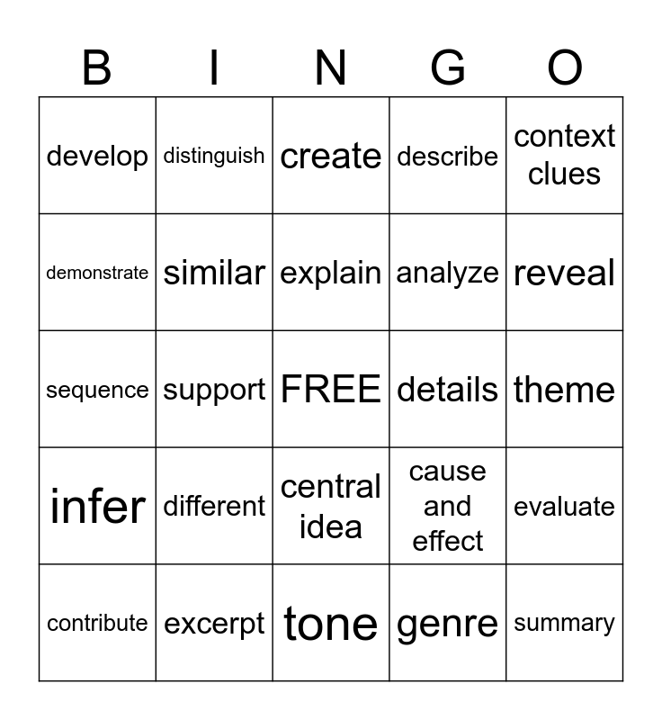 This bingo card has a free space and 29 words: contribute, suggest, support, response, develop, create, similar, different, details, excerpt, theme, summary, tone, genre, reveal, mood, central idea, infer, context clues, sequence, cause and effect, point of view, analyze, demonstrate, describe, distinguish, evaluate, explain and interpret.