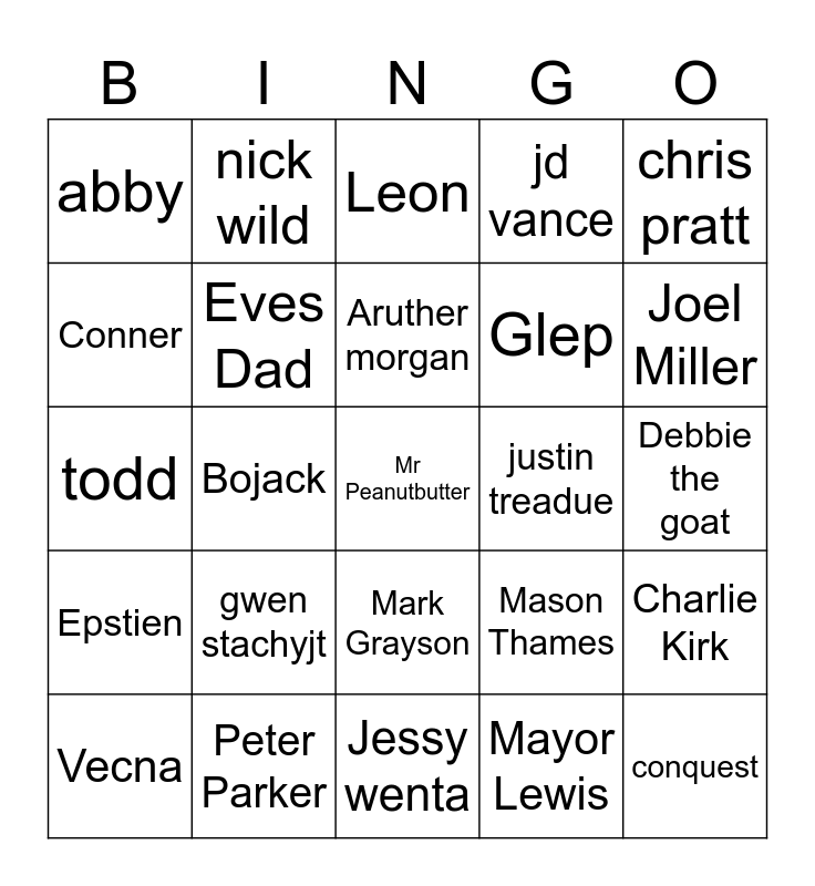 This bingo card has a free space and 24 words: gwen stachyjt, Peter Parker, Aruther morgan, Vecna, chris pratt, abby, Conner, nick wild, justin treadue, Mark Grayson, Glep, todd, Mason Thames, Charlie Kirk, Eves Dad, Mayor Lewis, Debbie the goat, Leon, Joel Miller, Bojack, conquest, Epstien, jd vance and Jessy wenta.