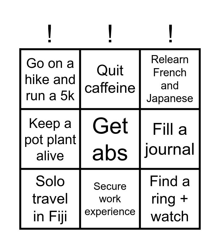 This bingo card has a free space and 8 words: Fill a journal, Relearn French and Japanese, Quit caffeine, Solo travel in Fiji, Go on a hike and run a 5k, Find a ring + watch, Keep a pot plant alive and Secure work experience.