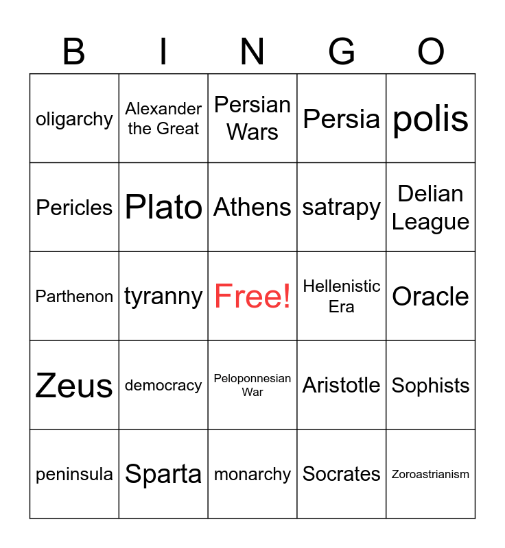 This bingo card has a free space and 24 words: democracy, Sparta, Athens, peninsula, polis, oligarchy, Pericles, Alexander the Great, Hellenistic Era, Peloponnesian War, satrapy, Parthenon, Aristotle, Sophists, Plato, Socrates, Oracle, Persian Wars, Delian League, tyranny, Zoroastrianism, Zeus, Persia and monarchy.