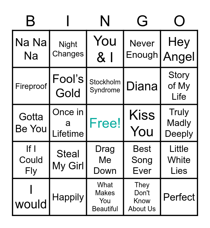 This bingo card has a free space and 44 words: Infinity, Perfect, Clouds, I would, What A Feeling, They Don't Know About Us, You & I, One Thing, Hey Angel, Happily, Never Enough, Kiss You, Drag Me Down, Steal My Girl, Over Again, What Makes You Beautiful, Heart Attack, Gotta Be You, Irresistible, Story of My Life, Night Changes, Olivia, Little Black Dress, Na Na Na, 18, Truly Madly Deeply, Home, History, Best Song Ever, If I Could Fly, Illusion, Little White Lies, Nobody Compares, Change Your Ticket, Once in a Lifetime, Ready to Run, Right Now, Same Mistakes, Stockholm Syndrome, Fireproof, Diana, Temporary Fix, Fool’s Gold and Don’t Forget Where You Belong.