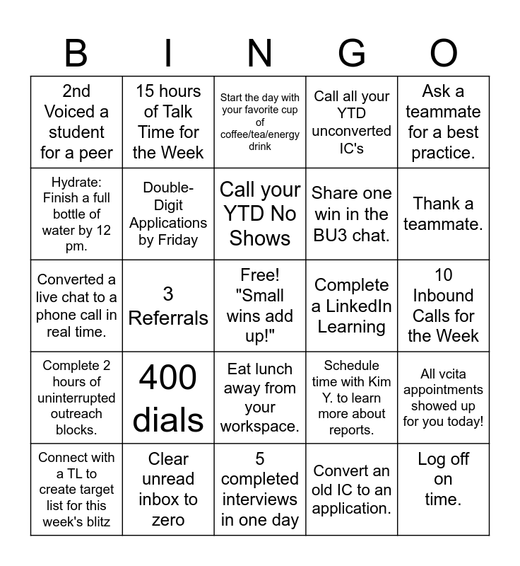 This bingo card has a free space and 24 words: 400 dials, Clear unread inbox to zero, Call your YTD No Shows, Connect with a TL to create target list for this week's blitz, Ask a teammate for a best practice., 2nd Voiced a student for a peer, Hydrate: Finish a full bottle of water by 12 pm., 15 hours of Talk Time for the Week, Complete a LinkedIn Learning, Eat lunch away from your workspace., Share one win in the BU3 chat., Converted a live chat to a phone call in real time., Schedule time with Kim Y. to learn more about reports., All vcita appointments showed up for you today!, Double-Digit Applications by Friday, Convert an old IC to an application., 10 Inbound Calls for the Week, Start the day with your favorite cup of coffee/tea/energy drink, Thank a teammate., 3 Referrals, Log off on time., Complete 2 hours of uninterrupted outreach blocks., Call all your YTD unconverted IC's and 5 completed interviews in one day.