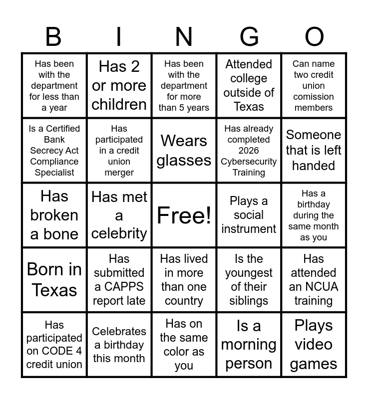This bingo card has a free space and 29 words: Has participated on CODE 4 credit union, Someone that has a pet, Has met a celebrity, Speaks more than 2 languages, Has been with the department for less than a year, Has been with the department for more than 5 years, Has participated in a credit union merger, Has submitted a CAPPS report late, Plays a social instrument, Celebrates a birthday this month, Has a birthday during the same month as you, Plays video games, Has on the same color as you, Is a morning person, Someone that is left handed, Someone that has traveled out of the country, Has lived in more than one country, Born in Texas, Can name two credit union comission members, Has broken a bone, Is the youngest of their siblings, Has run a 5K or greater, Has already completed 2026 Cybersecurity Training, Is a Certified Bank Secrecy Act Compliance Specialist, Attended college outside of Texas, Has 2 or more children, Has attended an NCUA training, Wears glasses and Doesn't own a pet.