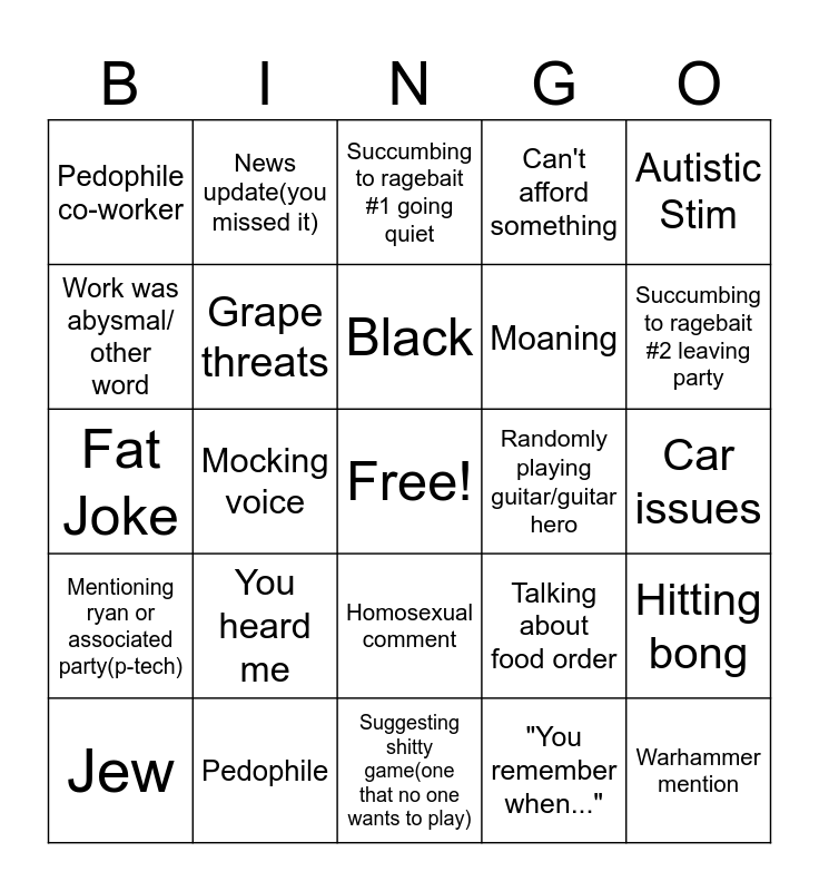 This bingo card has a free space and 24 words: You heard me, Pedophile, Black, Jew, Autistic Stim, Pedophile co-worker, Work was abysmal/ other word, News update(you missed it), Randomly playing guitar/guitar hero, Homosexual comment, Moaning, Fat Joke, Talking about food order, Hitting bong, Grape threats, "You remember when...", Car issues, Succumbing to ragebait #1 going quiet, Succumbing to ragebait #2 leaving party, Mocking voice, Warhammer mention, Mentioning ryan or associated party(p-tech), Can't afford something and Suggesting shitty game(one that no one wants to play).