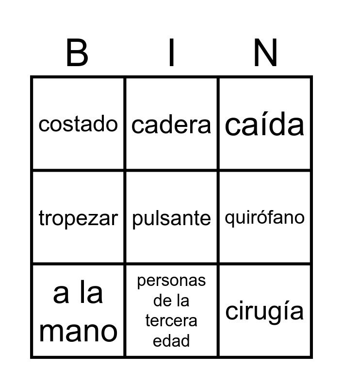 This bingo card has 12 words: Free!, cirugía, pulsante, quirófano, cadera, caída, personas de la tercera edad, adultos mayores, costado, tropezar, a la mano and camilla.
