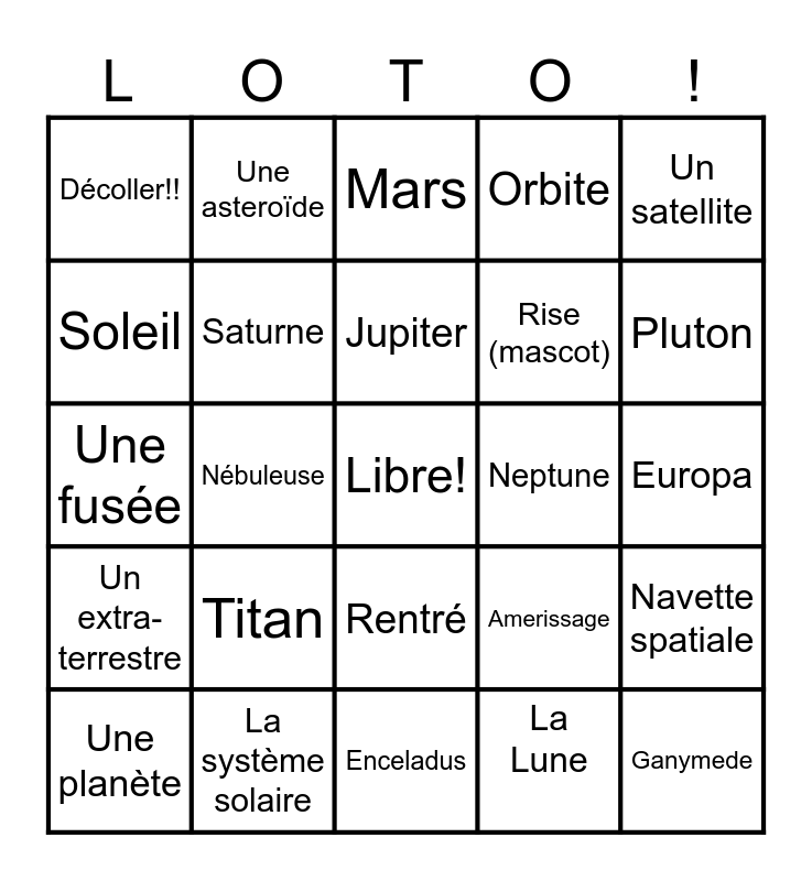 This bingo card has a free space and 34 words: Artemis 2, La Lune, La Terre, Une étoile, Un extra-terrestre, Saturne, Un satellite, Une planète, Une asteroïde, Un comète, Jupiter, Mars, Vénus, Mercure, Neptune, Pluton, La système solaire, Une fusée, Titan, Amerissage, Rentré, Gravité zéro, Décoller!!, Europa, Enceladus, Ganymede, Orbite, Combination spatiale, Rise (mascot), Soleil, Galaxie, Nébuleuse, Navette spatiale and O.V.N.I..