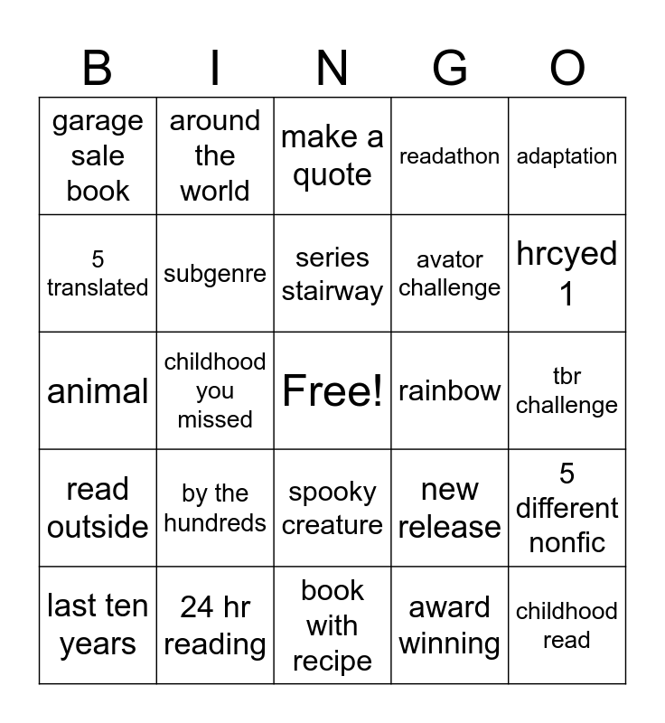 This bingo card has a free space and 24 words: by the hundreds, 24 hr reading, series stairway, last ten years, adaptation, garage sale book, 5 translated, around the world, rainbow, spooky creature, avator challenge, animal, new release, 5 different nonfic, subgenre, award winning, tbr challenge, make a quote, hrcyed 1, childhood you missed, childhood read, read outside, readathon and book with recipe.
