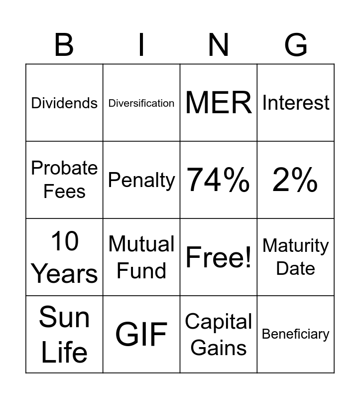 This bingo card has 19 words: Free!, Principal Guarantee, MER, Beneficiary, Maturity Date, Probate Fees, Capital Gains, Dividends, Diversification, 10 Years, Mutual Fund, Penalty, 74%, GIF, Sun Life, Bond, Interest, 2% and Medium.