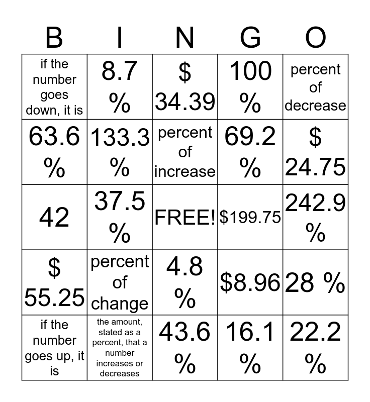 This bingo card has a free space and 24 words: percent of change, the amount, stated as a percent, that a number increases or decreases, percent of increase, if the number goes up, it is, percent of decrease, if the number goes down, it is, 63.6 %, 8.7 %, $199.75, 4.8 %, 69.2 %, 42, $8.96, 28 %, 133.3 %, 16.1 %, 242.9 %, $ 34.39, $ 24.75, 37.5 %, 22.2 %, $ 55.25, 100 % and 43.6 %.