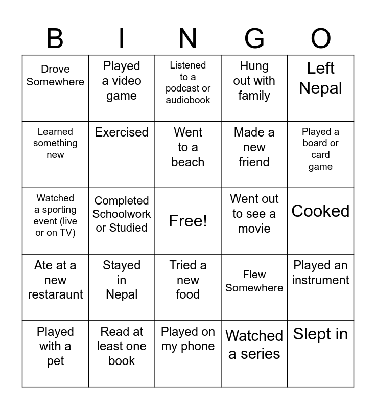 This bingo card has a free space and 24 words: Stayed in Nepal, Read at least one book, Went to a beach, Played with a pet, Left Nepal, Drove Somewhere, Learned something new, Played a video game, Went out to see a movie, Tried a new food, Made a new friend, Watched a sporting event (live or on TV), Flew Somewhere, Played an instrument, Exercised, Watched a series, Cooked, Listened to a podcast or audiobook, Played a board or card game, Completed Schoolwork or Studied, Slept in, Ate at a new restaraunt, Hung out with family and Played on my phone.