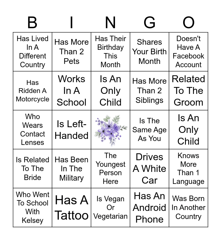 This bingo card has a free space and 30 words: Has A Tattoo, Married For More Than 21 Years, Is Left-Handed, Doesn't Drink Coffee, Has Lived In A Different Country, Has Their Birthday This Month, Works In A School, The Youngest Person Here, Is The Same Age As You, Is Vegan Or Vegetarian, Is An Only Child, Was Born In Another Country, Has An Android Phone, Has 3 Vowels In Their First Name, Related To The Groom, Owns Their Own Business, Drives A White Car, Is Related To The Bride, Has Been In The Military, Doesn't Have A Facebook Account, Who Wears Contact Lenses, Has Left The Country In The Last 6 Months, Has More Than 2 Pets, Has More Than 2 Siblings, Has Ridden A Motorcycle, Shares Your Birth Month, Knows More Than 1 Language, Who Went To School With Kelsey, Is An Only Child and Got Married In August.
