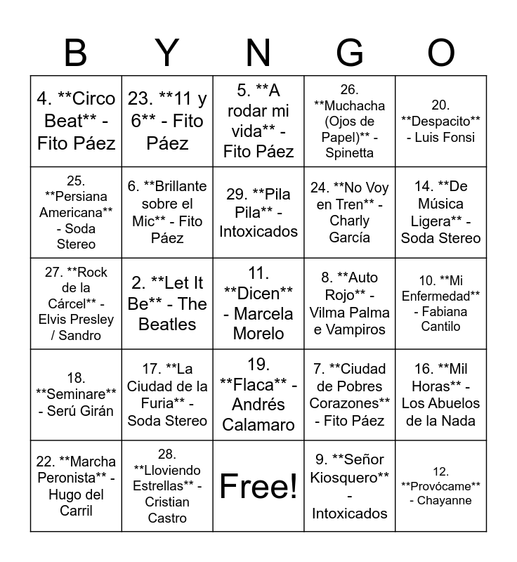 This bingo card has 31 words: Free!, 1. **Fanático** - Lali, 2. **Let It Be** - The Beatles, 3. **Mariposa Tecknicolor** - Fito Páez, 4. **Circo Beat** - Fito Páez, 5. **A rodar mi vida** - Fito Páez, 6. **Brillante sobre el Mic** - Fito Páez, 7. **Ciudad de Pobres Corazones** - Fito Páez, 8. **Auto Rojo** - Vilma Palma e Vampiros, 9. **Señor Kiosquero** - Intoxicados, 10. **Mi Enfermedad** - Fabiana Cantilo, 11. **Dicen** - Marcela Morelo, 12. **Provócame** - Chayanne, 13. **Feliz Cumpleaños**, 14. **De Música Ligera** - Soda Stereo, 15. **Ji Ji Ji** - Los Redondos, 16. **Mil Horas** - Los Abuelos de la Nada, 17. **La Ciudad de la Furia** - Soda Stereo, 18. **Seminare** - Serú Girán, 19. **Flaca** - Andrés Calamaro, 20. **Despacito** - Luis Fonsi, 21. **Waka Waka** - Shakira, 22. **Marcha Peronista** - Hugo del Carril, 23. **11 y 6** - Fito Páez, 24. **No Voy en Tren** - Charly García, 25. **Persiana Americana** - Soda Stereo, 26. **Muchacha (Ojos de Papel)** - Spinetta, 27. **Rock de la Cárcel** - Elvis Presley / Sandro, 28. **Lloviendo Estrellas** - Cristian Castro, 29. **Pila Pila** - Intoxicados and 30. **La Bifurcada** - Memphis La Blusera.