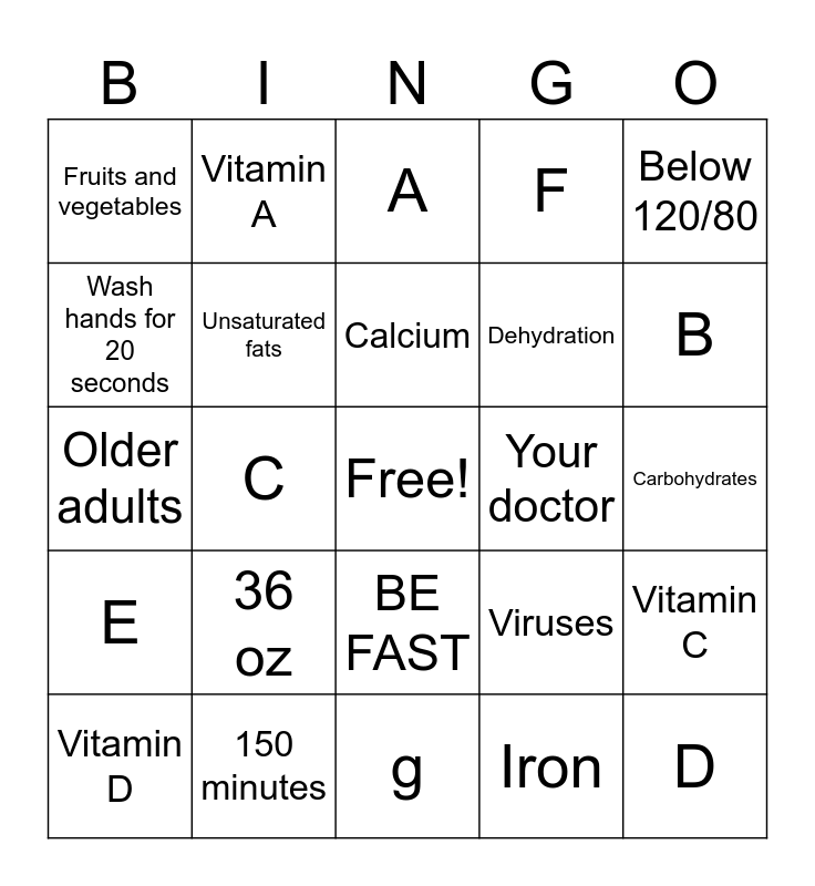 This bingo card has a free space and 24 words: 36 oz, 150 minutes, Calcium, Vitamin D, Below 120/80, Fruits and vegetables, Wash hands for 20 seconds, Vitamin A, Your doctor, BE FAST, Dehydration, Older adults, Viruses, Vitamin C, Unsaturated fats, Iron, Carbohydrates, A, B, C, D, E, F and g.