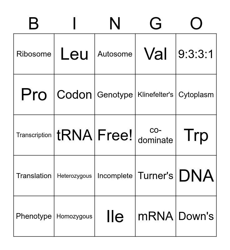 This bingo card has a free space and 24 words: Heterozygous, Homozygous, Genotype, Phenotype, 9:3:3:1, Ribosome, Pro, Leu, co-dominate, Incomplete, Klinefelter's, Transcription, Turner's, DNA, Codon, mRNA, Trp, Autosome, Cytoplasm, tRNA, Down's, Translation, Val and Ile.