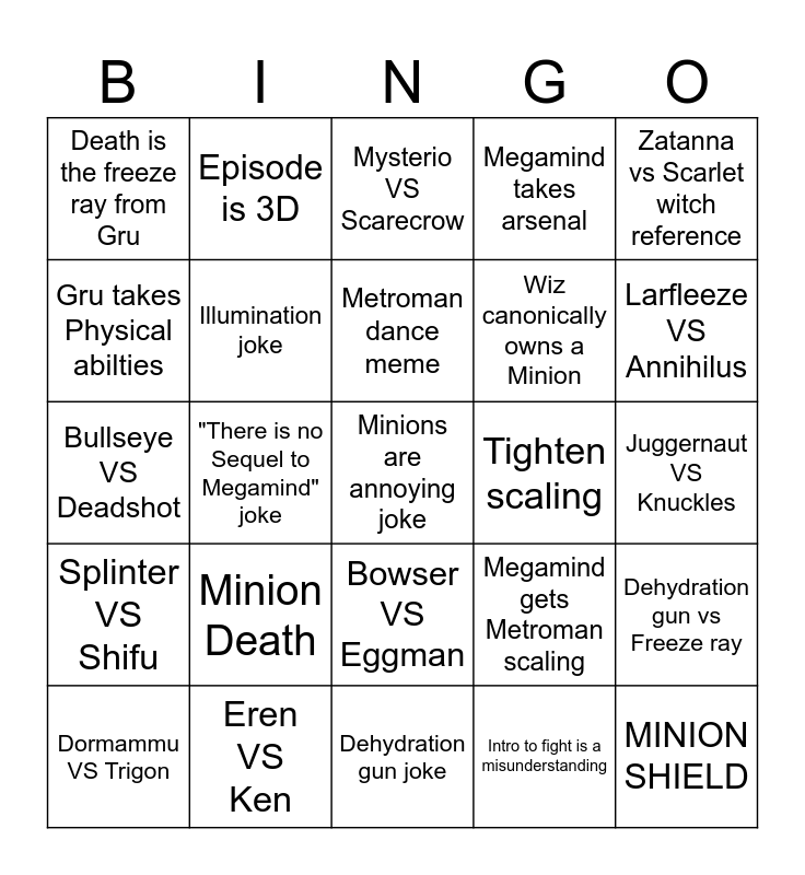 This bingo card has a free space and 49 words: Track is titled Despicable Mind, MINION SHIELD, Referencing the PRESENTATION speech, Dehydration gun joke, Minion Death, Fake-out Death, Episode is 3D, Animated by M0R0, Gru takes Physical abilties, schaffrillas reference in fight, Illumination joke, Megamind takes arsenal, Dehydration gun vs Freeze ray, Megamind gets Metroman scaling, Death is the super laser from Megamind, Megamind show gives Megamind the win, Metroman dance meme, Tighten scaling, Minions > Brainbots, Zatanna vs Scarlet witch reference, "There is no Sequel to Megamind" joke, Intro to fight is a misunderstanding, Death is the freeze ray from Gru, Wiz canonically owns a Minion, Catwoman VS Black Cat, Larfleeze VS Annihilus, Dormammu VS Trigon, Judge Dredd VS Punisher, Bowser VS Eggman, Splinter VS Shifu, Belos VS Father, Ruby VS Maka, King Bradley VS Solidus Snake, Luigi VS Pac-Man, Eren VS Ken, He-Man VS Shazam, K. Rool VS Gruntilda, Buffy VS Blade, Juggernaut VS Knuckles, Samus VS Master Chief, Hellboy VS Nero, Spider-Man VS Ladybug, Constantine VS Kuzunoha, Gwen VS Atom Eve, Bullseye VS Deadshot, Mysterio VS Scarecrow, Deathstroke VS Taskmaster, Neo VS Kirito and Neku VS Minato.