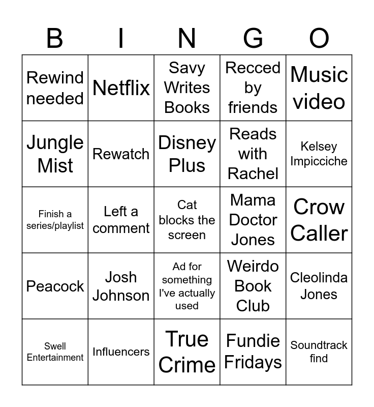 This bingo card has a free space and 86 words: Ad for AI, Ad for shitty wellness product, Ad for something I've actually used, Ad frequent enough to annoy, Amanda the Jedi, Annamarie Forcino, Are the straights okay?, Bad books, Bad movies,, Bright Sun, campaign add for shitty politician, Christy Anne Jones, Cleolinda Jones, Crow Caller, D'Angelo Wallace, Disney Plus, DNF, Dominic Noble, Fandom, Fanvids, Favorite Actors, Finish a History tab, Finish a series/playlist, Finish a YT ad break without skipping, Fundie Fridays, Good media reaction, HBO Max, Hey it's that guy!, History Buffs, Hulu, Influencers, Jamie Wolfer, Jenny Nicholson, Josh Johnson, Jungle Mist, Kate Cavanaugh, Kelsey Impicciche, Kennie JD, KrimsonRogue, Left a comment, lilsimsie, LGBTQ+, Made me cry, Mama Doctor Jones, Memphis mention!, Music video, mynameismarines, Netflix, Netta heard me laughing, Nicole Sweeney, Nostalgia, Over 1 hour, Peacock, Politics, Prime, Pushing Up Roses, The Queer Kiwi, Reads with Rachel, Recced by friends, Rewatch, Rewind needed, Ryan Hollinger, Sarah Z, Saved from tumblr, Saved livestream, Savy Writes Books, Shipwrecked, Soundtrack find, Squee!, St Andrew, Strange Aeons, Suddenly unavaliable, Swell Entertainment, TBW, They Got it Wrong, Travel, True Crime, Under 5 Minutes, Video games, Watch while writing, Watch with Pogo, Watch with tumblr, Watcher, Weddings, Weirdo Book Club and Writing.