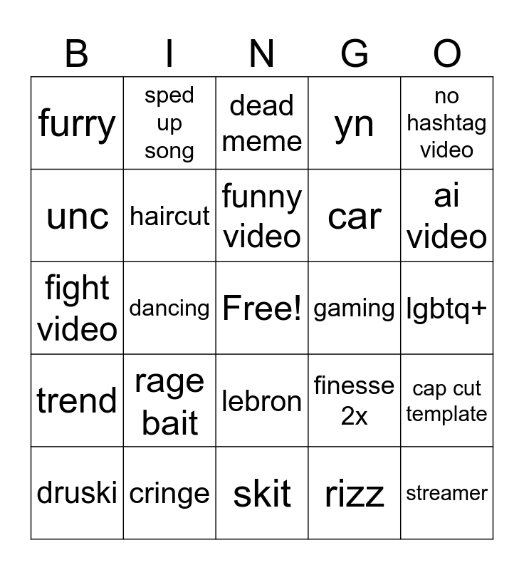 This bingo card has a free space and 24 words: rage bait, cringe, funny video, druski, no hashtag video, furry, unc, sped up song, gaming, lebron, car, fight video, finesse 2x, cap cut template, haircut, rizz, lgbtq+, dead meme, ai video, dancing, streamer, trend, yn and skit.