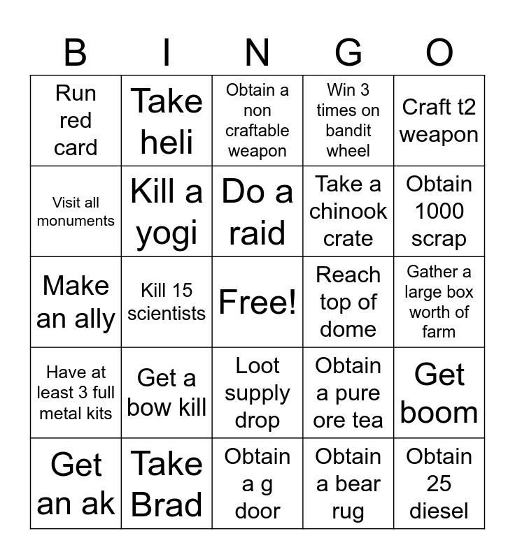 This bingo card has a free space and 24 words: Get a bow kill, Take Brad, Do a raid, Get an ak, Craft t2 weapon, Run red card, Visit all monuments, Take heli, Reach top of dome, Loot supply drop, Take a chinook crate, Make an ally, Obtain a pure ore tea, Get boom, Kill a yogi, Obtain a bear rug, Gather a large box worth of farm, Obtain a non craftable weapon, Obtain 1000 scrap, Kill 15 scientists, Obtain 25 diesel, Have at least 3 full metal kits, Win 3 times on bandit wheel and Obtain a g door.