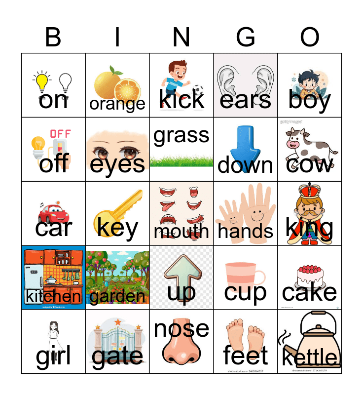 This bingo card has 24 images, a free space and 24 words: garden, gate, grass, girl, boy, on, off, orange, hands, up, down, car, cup, cake, eyes, feet, king, kick, cow, key, kettle, kitchen, ears and nose.