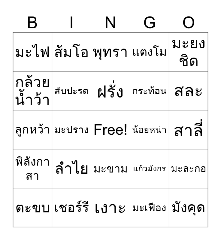 This bingo card has a free space and 50 words: ทุเรียน, มังคุด, มะม่วง, เงาะ, ลำไย, ลิ้นจี่, ส้มโอ, ส้มเขียวหวาน, กล้วยน้ำว้า, กล้วยหอม, สับปะรด, แตงโม, มะละกอ, แก้วมังกร, ขนุน, ชมพู่, ฝรั่ง, น้อยหน่า, ละมุด, มะยงชิด, มะปราง, มะเฟือง, มะไฟ, กระท้อน, ลองกอง, ลางสาด, สละ, ระกำ, พุทรา, มะขาม, มะขามเทศ, องุ่น, แอปเปิ้ล, สตรอว์เบอร์รี, เชอร์รี, บลูเบอร์รี, กีวี่, ลูกพลับ, ลูกท้อ (พีช), สาลี่, ทับทิม, อะโวคาโด, เสาวรส, มะพร้าว, ตะขบ, ลูกหว้า, มะดัน, มะกอก, พิลังกาสา and อินทผลัม.