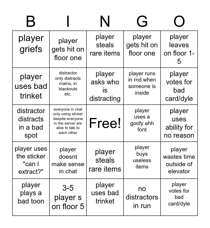 This bingo card has a free space and 55 words: player gets in the way of the distractor, player plays a bad toon, player runs into twisted, player griefs, player uses bad trinket, distractor distracts in a bad spot, distractor only distracts mains, in blackouts etc., player uses the sticker "can I extract?", player runs in rnd when someone is inside, player breaks rodger and gets hit, player gets hit on floor one, two or more players get hit on floor 1-3, player dies on floor 1-3, player gets hit from a common toon, player doesnt make sense in chat, 3-5 player s on floor 5, player leaves on floor 1-5, everyone in chat only using sticker despite everyone in the server are able to talk to each other, toxicity/ player using "Smart thinking!" to literally everything, player votes for bad card/dyle, player uses a goofy ahh font, 2 or more distractors distracting at the same time, player buys useless items, player steals rare items, player is elevator camping, player asks who is distracting, no distractors in run, distractor using a bad distracting toon, player uses ability for no reason, player wastes time outside of elevator, player gets in the way of the distractor, player plays a bad toon, player runs into twisted, player griefs, player uses bad trinket, distractor distracts in a bad spot, distractor only distracts mains, in blackouts etc., player uses the sticker "can I extract?", player runs in rnd when someone is inside, player breaks rodger and gets hit, player gets hit on floor one, two or more players get hit on floor 1-3, player dies on floor 1-3, player gets hit from a common toon, player doesnt make sense in chat, 3-5 player s on floor 5, player leaves, everyone in chat only using sticker despite everyone in the server are able to talk to each other, toxicity/ player using "Smart thinking!" to literally everything, player votes for bad card/dyle, player uses a goofy ahh font, 2 or more distractors distracting at the same time, player buys useless items, player steals rare items and player is elevator camping.