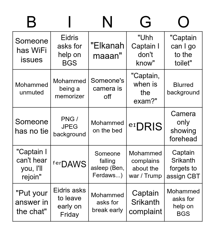 This bingo card has a free space and 24 words: ᶠᵉʳDAWS, Eidris asks to leave early on Friday, Someone's camera is off, "Put your answer in the chat", "Captain can I go to the toilet", Someone has WiFi issues, Mohammed unmuted, Eidris asks for help on BGS, ᵉᶦDRIS, Someone falling asleep (Ben, Ferdaws...), "Captain, when is the exam?", Someone has no tie, Mohammed complains about the war / Trump, Captain Srikanth forgets to assign CBT, Mohammed being a memorizer, Captain Srikanth complaint, Camera only showing forehead, "Elkanah maaan", Blurred background, PNG / JPEG background, Mohammed asks for help on BGS, "Captain I can't hear you, I'll rejoin", "Uhh Captain I don't know" and Mohammed asks for break early.