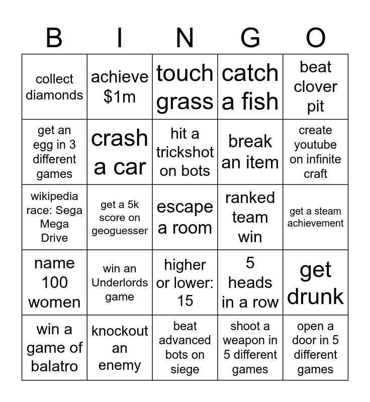 This bingo card has 25 words: win an Underlords game, beat advanced bots on siege, hit a trickshot on bots, win a game of balatro, beat clover pit, collect diamonds, get an egg in 3 different games, achieve $1m, ranked team win, higher or lower: 15, break an item, wikipedia race: Sega Mega Drive, 5 heads in a row, get drunk, crash a car, open a door in 5 different games, get a steam achievement, touch grass, create youtube on infinite craft, get a 5k score on geoguesser, escape a room, knockout an enemy, name 100 women, catch a fish and shoot a weapon in 5 different games.