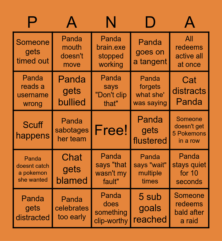 This bingo card has a free space and 24 words: Chat gets blamed, Panda celebrates too early, Panda says "Don't clip that", Panda gets distracted, All redeems active all at once, Someone gets timed out, Panda reads a username wrong, Panda mouth doesn't move, Panda gets flustered, Panda says "that wasn't my fault", Panda forgets what she' was saying, Scuff happens, Panda says "wait" multiple times, Panda stays quiet for 10 seconds, Panda gets bullied, 5 sub goals reached, Someone doesn't get 5 Pokemons in a row, Panda brain.exe stopped working, Cat distracts Panda, Panda sabotages her team, Someone redeems bald after a raid, Panda doesnt catch a pokemon she wanted, Panda goes on a tangent and Panda does something clip-worthy.