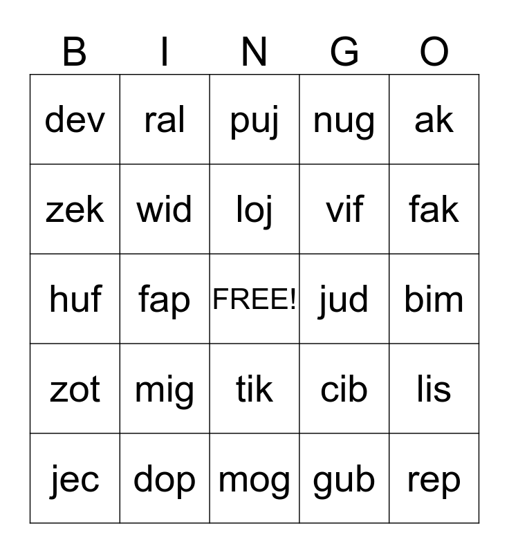 This bingo card has a free space and 24 words: mig, dop, loj, jec, ak, dev, zek, ral, jud, tik, vif, huf, cib, lis, wid, gub, bim, puj, fak, fap, rep, zot, nug and mog.