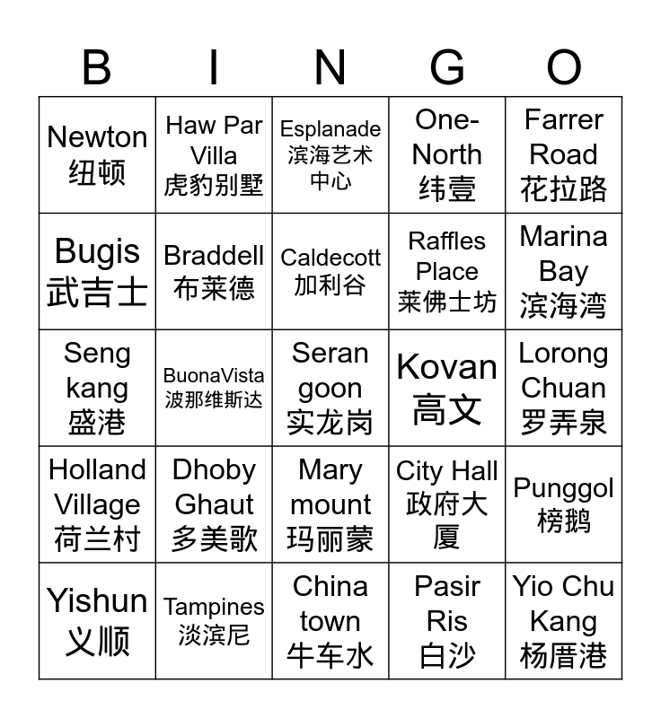 This bingo card has 39 words: Bishan碧山, Ang Mo Kio 宏茂桥, Toa Payoh 大巴窑, Braddell 布莱德, Yishun 义顺, Mary mount 玛丽蒙, Caldecott 加利谷, Botanic Gardens 植物园, Farrer Road 花拉路, Holland Village 荷兰村, BuonaVista 波那维斯达, One-North 纬壹, Seran goon 实龙岗, Lorong Chuan 罗弄泉, Kovan 高文, Dhoby Ghaut 多美歌, Orchard 乌节, Newton 纽顿, Novena 诺维娜, City Hall 政府大厦, Bugis武吉士, China town 牛车水, Raffles Place 莱佛士坊, Marina Bay 滨海湾, Little India 小印度, Khatib卡迪, Yio Chu Kang 杨厝港, Newton 纽顿, Kent Ridge 肯特岗, Haw Par Villa 虎豹别墅, Clarke Quay 克拉码头, Promenade宝门廊, Esplanade 滨海艺术中心, Tampines 淡滨尼, Pasir Ris 白沙, Changi Airport 樟宜机场, Punggol榜鹅, Seng kang 盛港 and Wood lands 兀兰.