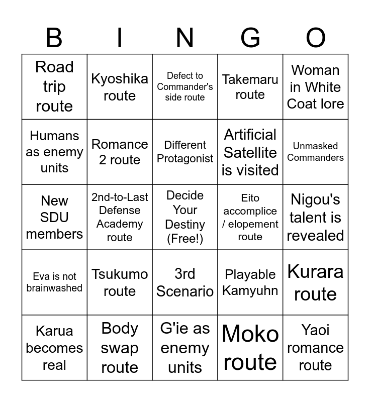 This bingo card has a free space and 24 words: Tsukumo route, Body swap route, Different Protagonist, Karua becomes real, Woman in White Coat lore, Road trip route, Humans as enemy units, Kyoshika route, Eito accomplice / elopement route, 3rd Scenario, Artificial Satellite is visited, New SDU members, Playable Kamyuhn, Kurara route, Romance 2 route, Moko route, Nigou's talent is revealed, Defect to Commander's side route, Unmasked Commanders, 2nd-to-Last Defense Academy route, Yaoi romance route, Eva is not brainwashed, Takemaru route and G'ie as enemy units.