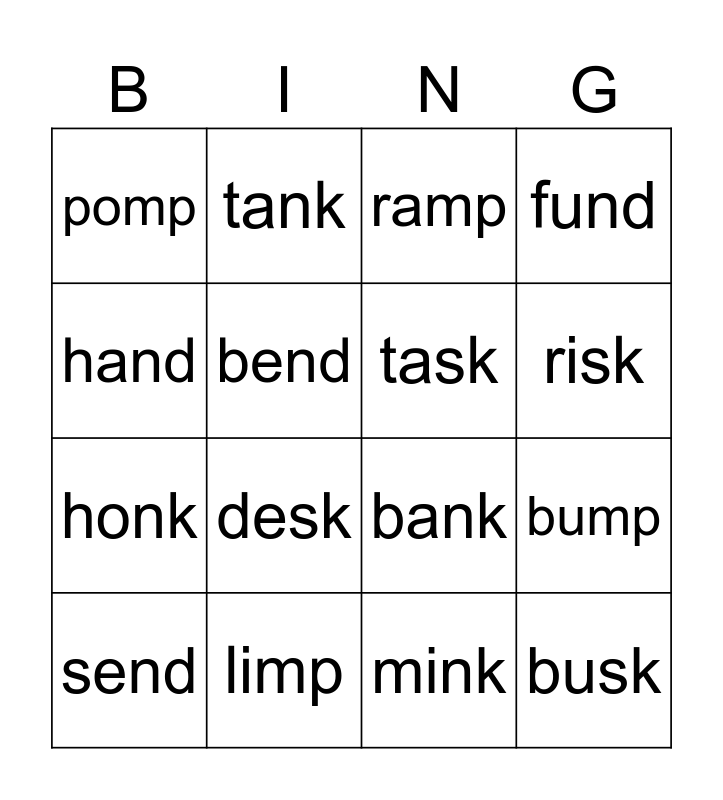 This bingo card has 16 words: limp, bump, ramp, pomp, honk, tank, bank, mink, hand, bend, send, fund, desk, risk, task and busk.