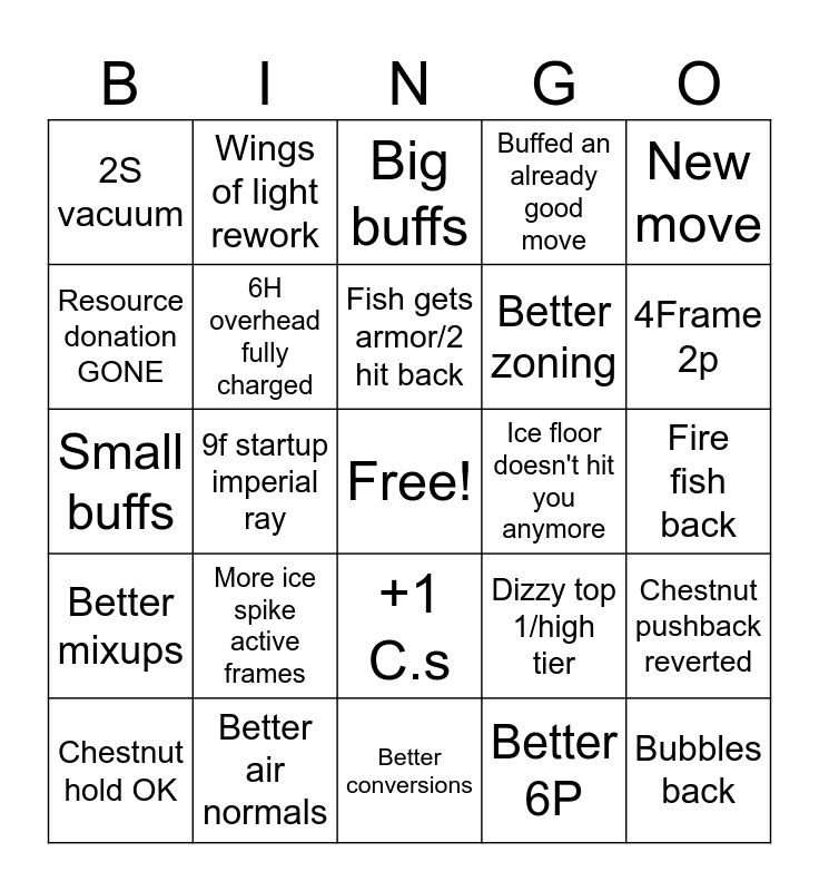 This bingo card has a free space and 24 words: More ice spike active frames, Better air normals, Fish gets armor/2 hit back, Chestnut hold OK, New move, 2S vacuum, Resource donation GONE, Wings of light rework, Ice floor doesn't hit you anymore, +1 C.s, Better zoning, Small buffs, Dizzy top 1/high tier, Chestnut pushback reverted, 6H overhead fully charged, Better 6P, Fire fish back, Big buffs, 4Frame 2p, 9f startup imperial ray, Bubbles back, Better mixups, Buffed an already good move and Better conversions.