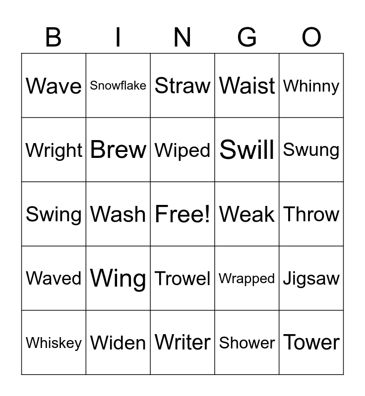 This bingo card has a free space and 209 words: Sweep, Swept, Flower, Pillow, Newt, Whale, Sweat, Wrote, Write, Snowflake, Wear, Swear, Sweet, Wipe, Swipe, Wait, Swarm, Show, Whirl, Twist, Twirl, Swirl, Whimper, Whisper, Wing, Swing, Tweak, Wake, Weak, Warm, Swig, Twin, Win, Twig, Wig, Winter, Whistle, White, Wish, Wet, Want, Went, Wind, Window, Wild, Worry, Worried, Answer, Witch, Wizard, Wiggle, Trowel, Towel, Tower, Wast, West, Waste, Power, Wonder, Wade, Widen, Wide, Narrow, Wot, Wont, Shower, Shown, Swore, Wore, Ware, Whin, Shawl, Whinny, Wolves, Swim, Wim, Wink, Squawk, Swung, Wart, Warthog, Tow, Town, Two, Wife, Wiped, Written, Weep, Wheel, Trawl, Few, Watch, Swatch, Switch, Water, Watermelon, Weather, Wean, Waggly, Waggle, Wick, Whack, Week, Wonderful, Straw, Stew, Seaweed, Throw, Wedding, Whisker, Whisk, Why, What, Where, Between, Blew, Clew, Flew, Slew, Crew, Brew, Drew, Grew, Jigsaw, Wise, Wolfhound, Weed, Were, Wendy, Whine, When, Twinkle, Twenty, Twelve, Wire, Wine, Waste, Wasteful, Wash, Wrench, View, Waddle, Wist, Well, Sandwich, Strawberry, Swoop, Whoop, Wicket, Whinge, Wear, Weigh, Wright, Weight, Knew, Wahoo, Wagon, Wallet, Wallpaper, Weasel, Walrus, Whiskey, Witter, Witty, Narwhal, Overwhelmed, Wickedly, Wicker, Wicked, Waft, Walt, Waltz, Walton, Waffle, Wrestle, Wry, Wryly, Wrongly, Will, Wurst, Willow, Follow, Swill, Wound, Would, Wager, Wages, Wage, Halloween, Hallow, Hallowed, Allow, Allowed, Writer, Wave, Waved, Waver, Wisp, Wispy, Wrist, Waist, Waisted, Wristband, Screw, Wept, Wealthy, Wealth, Wrapped and Wrapper.