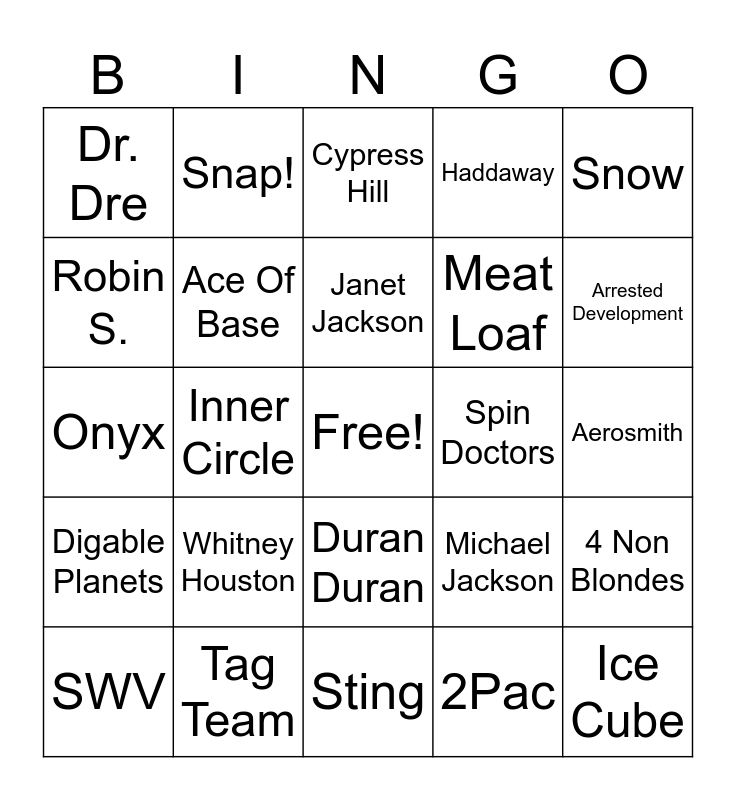 This bingo card has a free space and 24 words: Whitney Houston, Tag Team, Janet Jackson, SWV, Snow, Dr. Dre, Robin S., Snap!, Spin Doctors, Duran Duran, Meat Loaf, Onyx, Michael Jackson, 4 Non Blondes, Ace Of Base, 2Pac, Aerosmith, Cypress Hill, Arrested Development, Inner Circle, Ice Cube, Digable Planets, Haddaway and Sting.
