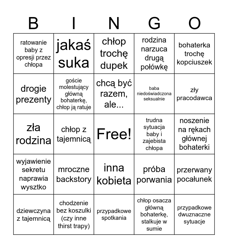 This bingo card has a free space and 24 words: dziewczyna z tajemnicą, mroczne backstory, chcą być razem, ale..., chłop osacza główną bohaterkę, stalkuje w sumie, bohaterka trochę kopciuszek, ratowanie baby z opresji przez chłopa, jakaś suka, chłop trochę dupek, trudna sytuacja baby i zajebista chłopa, noszenie na rękach głównej bohaterki, zła rodzina, goście molestujący główną bohaterkę, chłop ją ratuje, próba porwania, przerwany pocałunek, drogie prezenty, chodzenie bez koszulki (czy inne thirst trapy), przypadkowe spotkania, rodzina narzuca drugą połówkę, zły pracodawca, wyjawienie sekretu naprawia wysztko, chłop z tajemnicą, inna kobieta, baba niedoświadczona seksualnie and przypadkowe dwuznaczne sytuacje.
