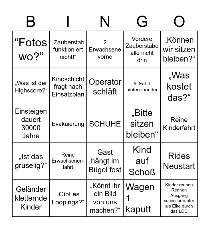 This bingo card has a free space and 24 words: Reine Erwachsenen-fahrt, „Gibt es Loopings?“, Operator schläft, Geländer kletternde Kinder, „Können wir sitzen bleiben?“, “Fotos wo?“, „Was ist der Highscore?“, „Zauberstab funktioniert nicht!“, „Bitte sitzen bleiben“, Gast hängt im Bügel fest, 5. Fahrt hintereinander, Einsteigen dauert 30000 Jahre, Kind auf Schoß, Rides Neustart, Kinoschicht fragt nach Einsatzplan, Wagen 1 kaputt, Reine Kinderfahrt, 2 Erwachsene vorne, „Was kostet das?“, Evakuierung, Kinder rennen Rennen Ausgang schneller runter als Eike durch das LDC, „Ist das gruselig?“, Vordere Zauberstäbe alle nicht drin and „Könnt ihr ein Bild von uns machen?“.