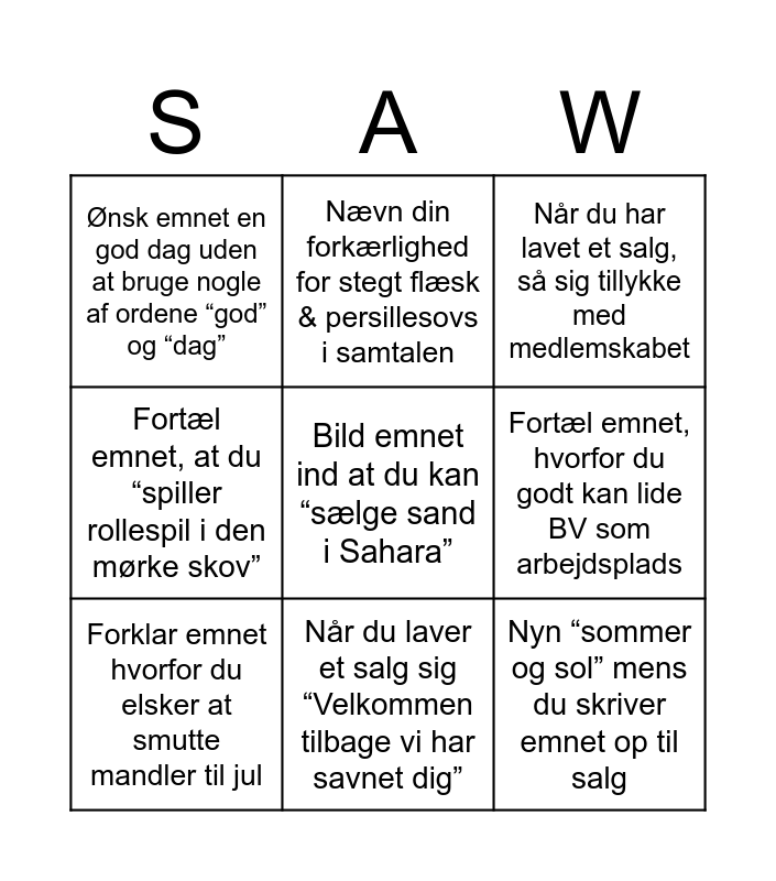 This bingo card has 20 words: Snak om vejret i din samtale, Afslut med Godt Nytår, Når du har lavet et salg, så sig tillykke med medlemskabet, Sig til emnet du snakker med “Jeg er simpelthen så glad for, at det lige er dig jeg har fået fat i”, Fortæl emnet “du lyder som min mor/far”, Bild emnet ind at du kan “sælge sand i Sahara”, Foreslå et salg på 67 kr, Ønsk emnet en god dag uden at bruge nogle af ordene “god” og “dag”, Nyn “sommer og sol” mens du skriver emnet op til salg, Nævn din forkærlighed for stegt flæsk & persillesovs i samtalen, Gø under samtalen, Nys og sig prosit til dig selv under samtalen, Fortæl emnet, hvorfor du godt kan lide BV som arbejdsplads, Præsenter dig på en anden måde end den du plejer når du indleder samtalen, Forklar emnet hvorfor du elsker at smutte mandler til jul, Hvis du laver et salg over dit mål så sig “Tak for i dag” til emnet, Når du laver et salg sig “Velkommen tilbage vi har savnet dig”, Fortæl emnet, at du “spiller rollespil i den mørke skov”, Sig “bip bup” som en telefon når du taster emnets oplysninger ind and Spørg emnet om de også glæder sig til Ros i år.