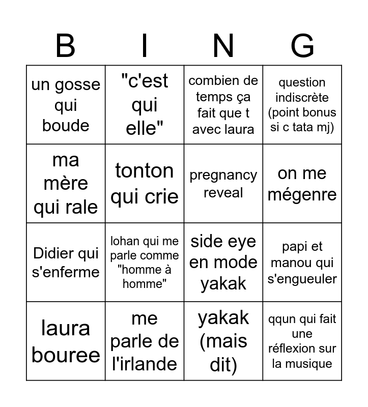 This bingo card has 16 words: me parle de l'irlande, papi et manou qui s'engueuler, combien de temps ça fait que t avec laura, un gosse qui boude, Didier qui s'enferme, "c'est qui elle", side eye en mode yakak, yakak (mais dit), ma mère qui rale, tonton qui crie, laura bouree, question indiscrète (point bonus si c tata mj), lohan qui me parle comme "homme à homme", on me mégenre, pregnancy reveal and qqun qui fait une réflexion sur la musique.