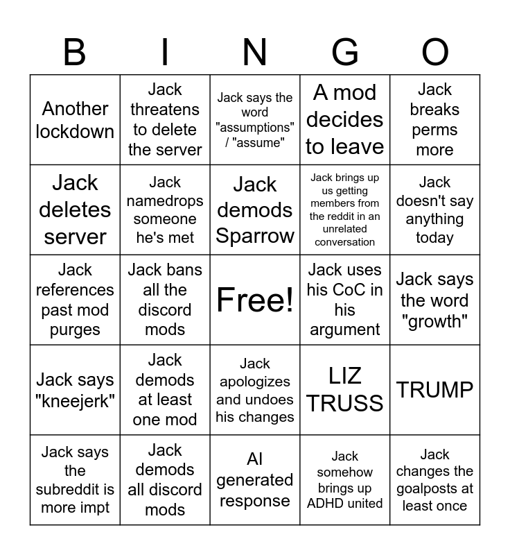 This bingo card has a free space and 24 words: Jack demods at least one mod, Jack demods all discord mods, Jack demods Sparrow, Jack says the subreddit is more impt, Jack breaks perms more, Another lockdown, Jack deletes server, Jack threatens to delete the server, Jack uses his CoC in his argument, Jack apologizes and undoes his changes, Jack brings up us getting members from the reddit in an unrelated conversation, Jack references past mod purges, LIZ TRUSS, TRUMP, Jack namedrops someone he's met, Jack somehow brings up ADHD united, Jack says the word "growth", Jack says the word "assumptions" / "assume", Jack doesn't say anything today, Jack bans all the discord mods, Jack changes the goalposts at least once, Jack says "kneejerk", A mod decides to leave and AI generated response.