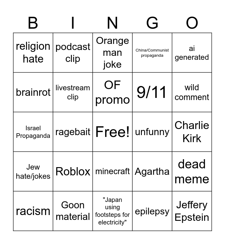 This bingo card has a free space and 24 words: Roblox, Goon material, OF promo, racism, ai generated, religion hate, brainrot, podcast clip, unfunny, minecraft, 9/11, Israel Propaganda, Agartha, dead meme, livestream clip, epilepsy, Charlie Kirk, Orange man joke, wild comment, ragebait, Jeffery Epstein, Jew hate/jokes, China/Communist propaganda and "Japan using footsteps for electricity".