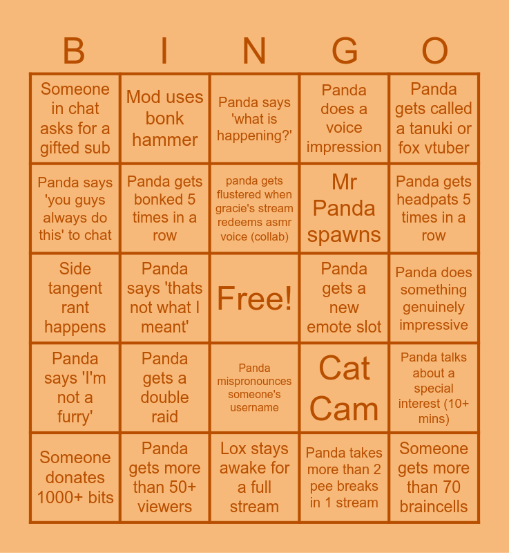 This bingo card has a free space and 24 words: Panda gets a double raid, Panda gets more than 50+ viewers, panda gets flustered when gracie's stream redeems asmr voice (collab), Someone donates 1000+ bits, Panda gets called a tanuki or fox vtuber, Someone in chat asks for a gifted sub, Panda says 'you guys always do this' to chat, Mod uses bonk hammer, Panda gets a new emote slot, Panda mispronounces someone's username, Mr Panda spawns, Side tangent rant happens, Cat Cam, Panda talks about a special interest (10+ mins), Panda gets bonked 5 times in a row, Panda takes more than 2 pee breaks in 1 stream, Panda does something genuinely impressive, Panda says 'what is happening?', Panda gets headpats 5 times in a row, Panda says 'thats not what I meant', Someone gets more than 70 braincells, Panda says 'I'm not a furry', Panda does a voice impression and Lox stays awake for a full stream.