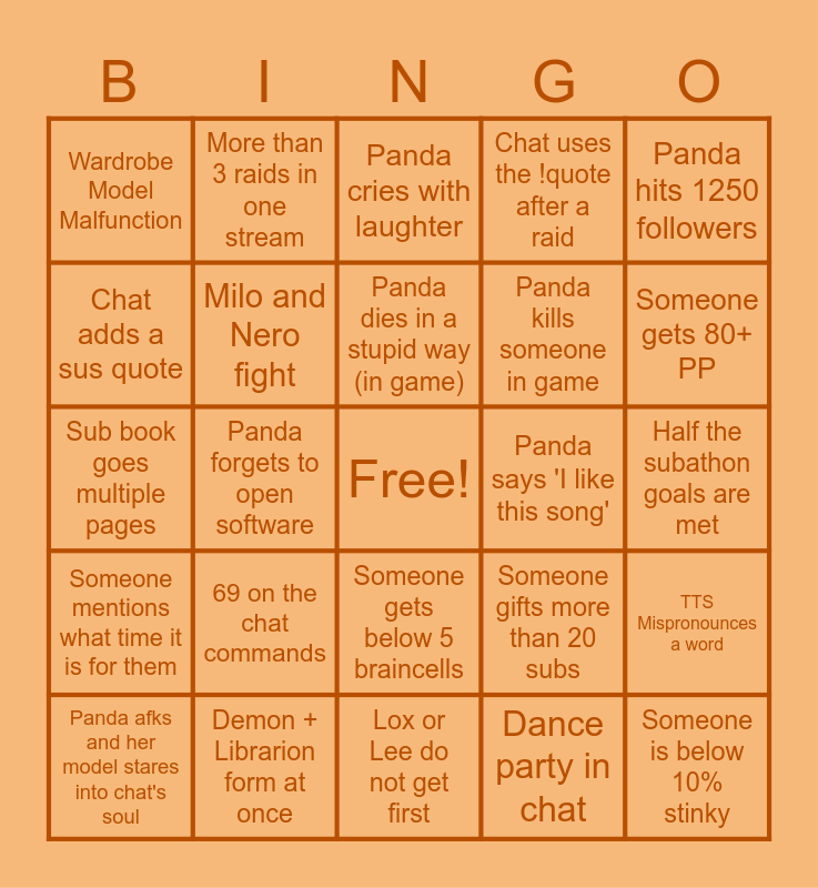 This bingo card has a free space and 24 words: 69 on the chat commands, Demon + Librarion form at once, Panda dies in a stupid way (in game), Panda afks and her model stares into chat's soul, Panda hits 1250 followers, Wardrobe Model Malfunction, Chat adds a sus quote, More than 3 raids in one stream, Panda says 'I like this song', Someone gets below 5 braincells, Panda kills someone in game, Sub book goes multiple pages, Someone gifts more than 20 subs, TTS Mispronounces a word, Milo and Nero fight, Dance party in chat, Half the subathon goals are met, Panda cries with laughter, Someone gets 80+ PP, Panda forgets to open software, Someone is below 10% stinky, Someone mentions what time it is for them, Chat uses the !quote after a raid and Lox or Lee do not get first.