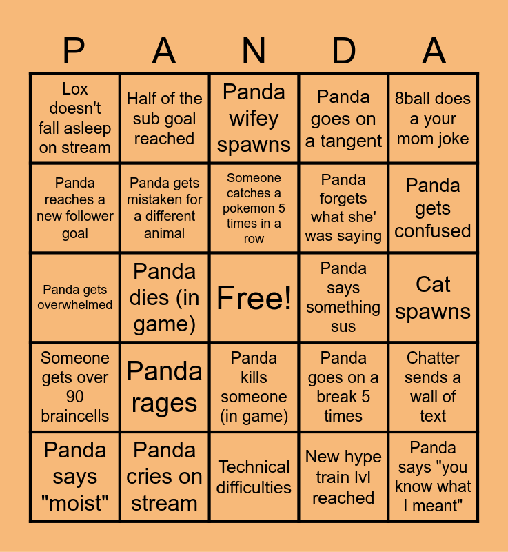 This bingo card has a free space and 24 words: Panda rages, Panda cries on stream, Someone catches a pokemon 5 times in a row, Panda says "moist", 8ball does a your mom joke, Lox doesn't fall asleep on stream, Panda reaches a new follower goal, Half of the sub goal reached, Panda says something sus, Panda kills someone (in game), Panda forgets what she' was saying, Panda gets overwhelmed, Panda goes on a break 5 times, Chatter sends a wall of text, Panda gets mistaken for a different animal, New hype train lvl reached, Cat spawns, Panda wifey spawns, Panda gets confused, Panda dies (in game), Panda says "you know what I meant", Someone gets over 90 braincells, Panda goes on a tangent and Technical difficulties.