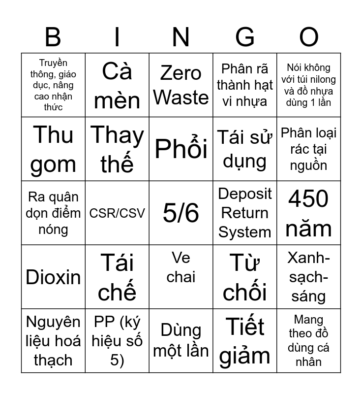 This bingo card has 25 words: Tái chế, Dùng một lần, Phổi, Nguyên liệu hoá thạch, Nói không với túi nilong và đồ nhựa dùng 1 lần, Truyền thông, giáo dục, nâng cao nhận thức, Thu gom, Cà mèn, Deposit Return System, Ve chai, Tái sử dụng, Ra quân dọn điểm nóng, Từ chối, Xanh-sạch-sáng, Thay thế, Mang theo đồ dùng cá nhân, 450 năm, Zero Waste, Phân loại rác tại nguồn, CSR/CSV, 5/6, PP (ký hiệu số 5), Dioxin, Phân rã thành hạt vi nhựa and Tiết giảm.