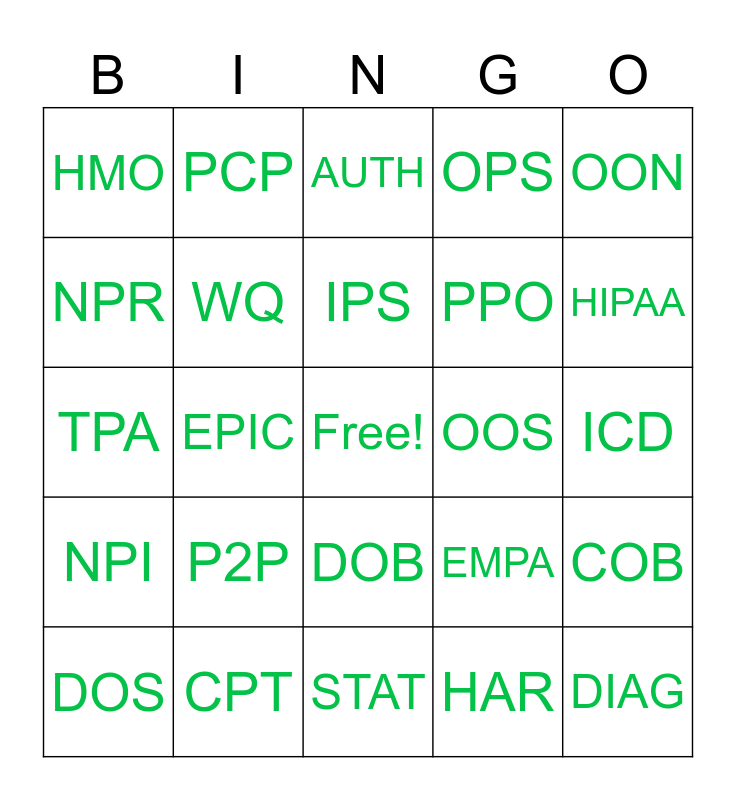 This bingo card has a free space and 24 words: P2P, CPT, IPS, DOS, OON, HMO, NPR, PCP, OOS, DOB, PPO, TPA, EMPA, COB, WQ, HAR, ICD, AUTH, HIPAA, EPIC, DIAG, NPI, OPS and STAT.