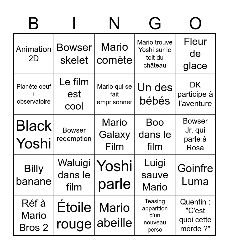This bingo card has a free space and 24 words: Waluigi dans le film, Étoile rouge, Mario qui se fait emprisonner, Réf à Mario Bros 2, Fleur de glace, Animation 2D, Planète oeuf + observatoire, Bowser skelet, Boo dans le film, Yoshi parle, Un des bébés, Black Yoshi, Luigi sauve Mario, Goinfre Luma, Le film est cool, Teasing apparition d'un nouveau perso, Bowser Jr. qui parle à Rosa, Mario comète, DK participe à l'aventure, Bowser redemption, Quentin : "C'est quoi cette merde ?", Billy banane, Mario trouve Yoshi sur le toit du château and Mario abeille.